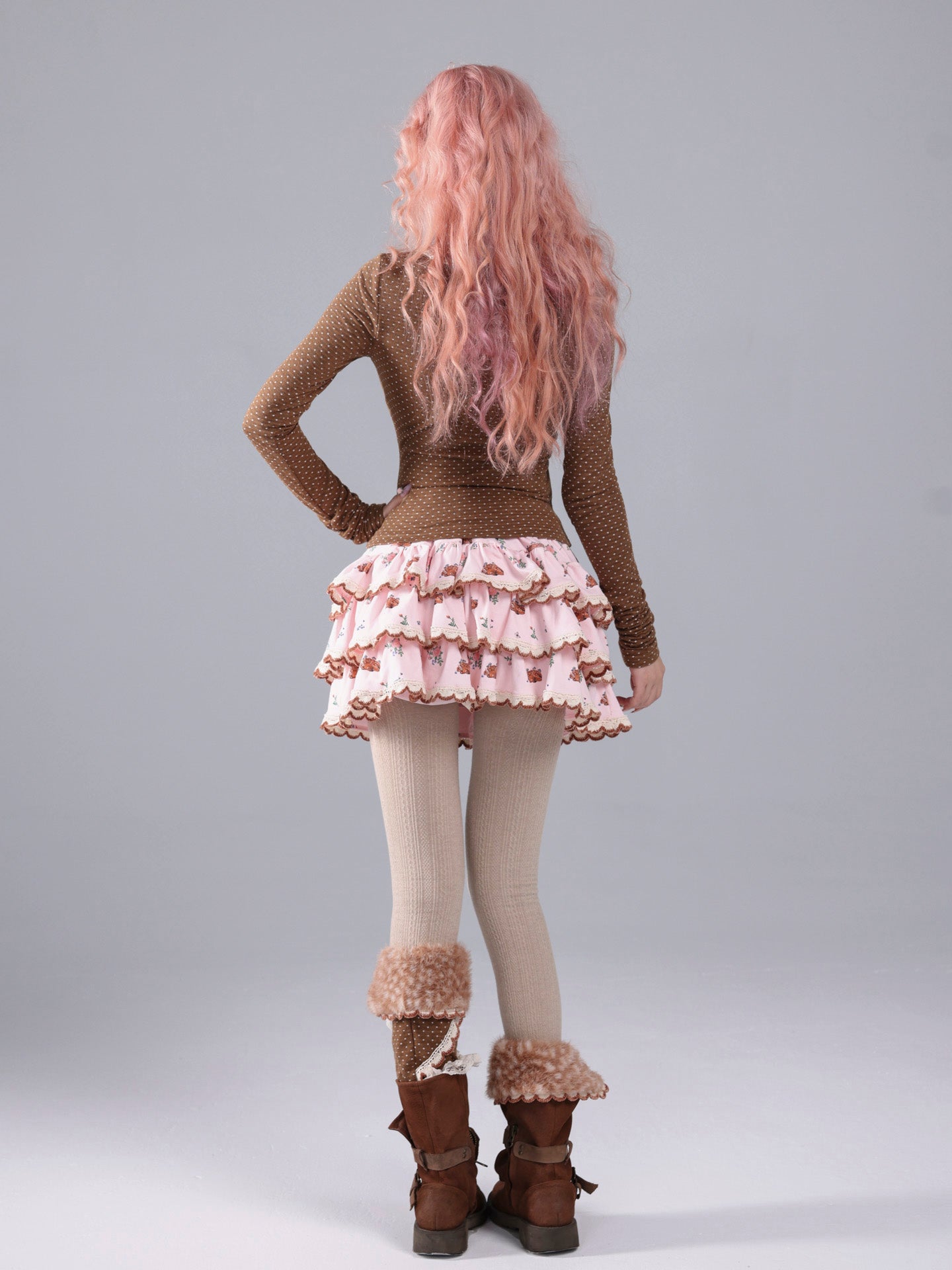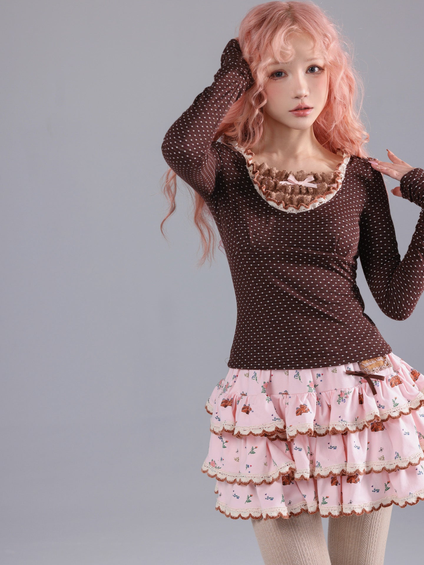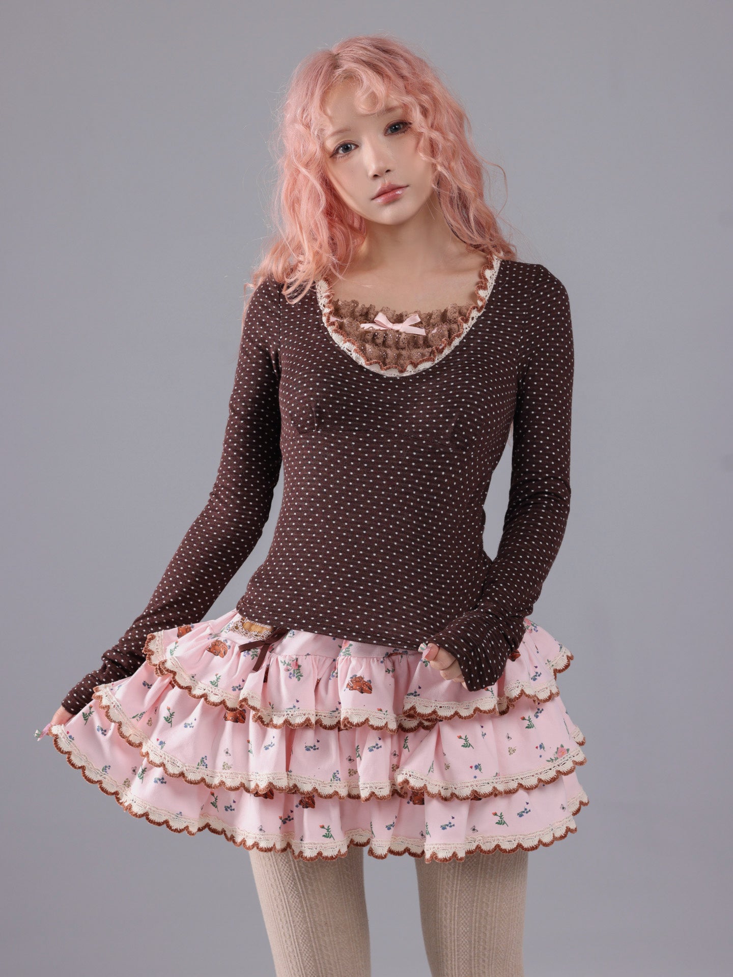 ROSE ISLAND Brown Polka Dot Knit Lace Splice Long-Sleeve Base Shirt for Autumn and Winter